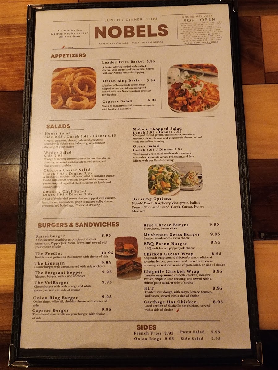 The menu at Nobels offers a comfortable blend of casual American dining with thoughtfully prepared dishes that suit a variety of times and moods. Whether you're stopping by for a relaxed lunch, a casual dinner, or a bite while enjoying the warm, inviting atmosphere, you'll find familiar favorites made with attention to flavor and quality.